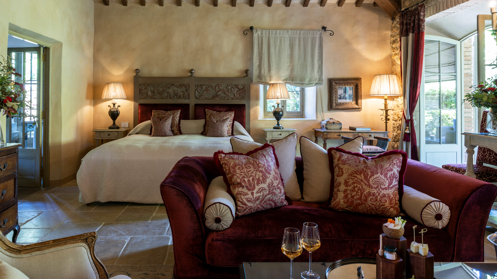 The private garden suite of Rosmarino is a well-appointed Tuscan retreat being defined by its rich tapestries, exposed stone walls, high arched wood ceiling, big slab stone floors, carved bed and hand-painted mural of bygone travelers who have crossed this land. The fire-side ruby-red chaise lounge and sitting chairs offer another opportunity to let the gentle embrace of the silence bring you complete relaxation in this private garden suite.